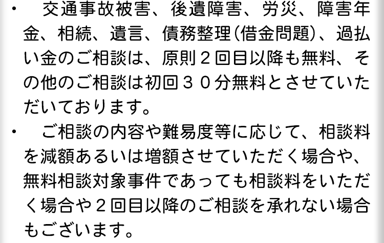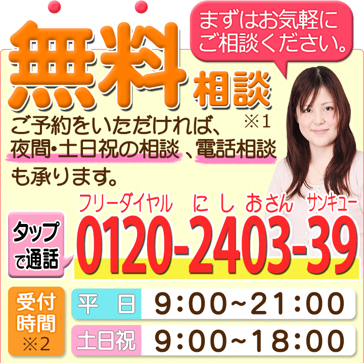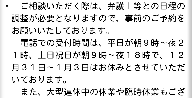 期限がある手続きもあるため、早めの対応が大切です。当事務所は相談料を原則無料とし、相談日も夜間・土日祝日での調整も可能ですので、まずはお問い合わせください。