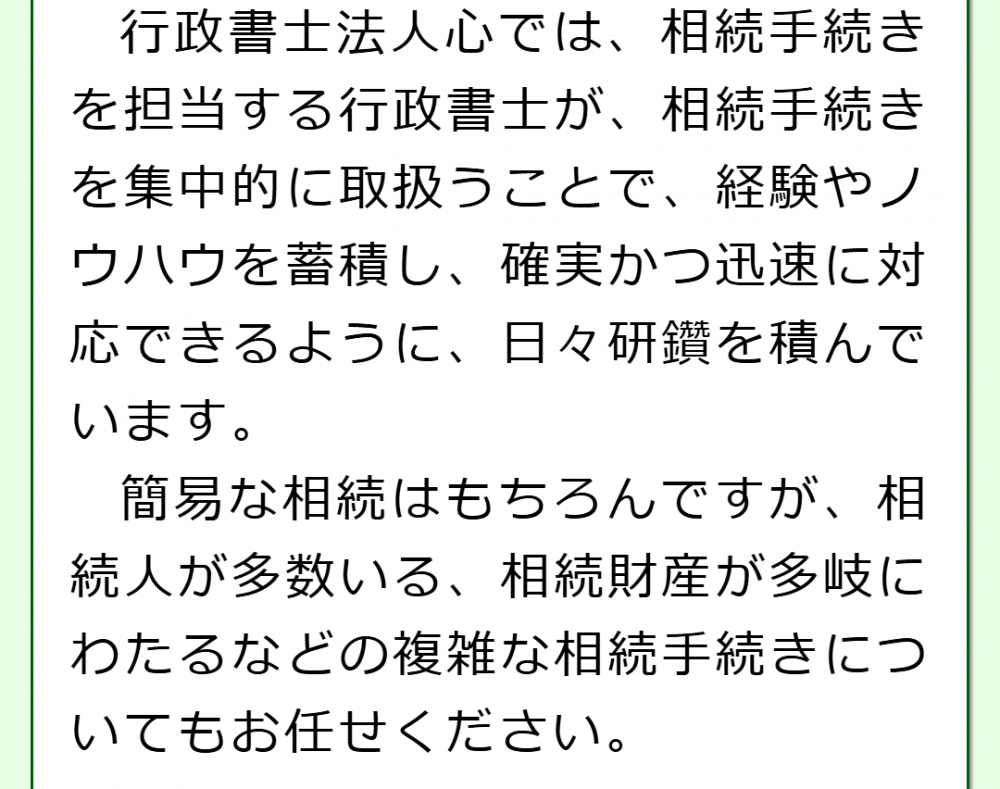 相続手続きを得意とする行政書士が、遺産分割協議書に形式面の不備は無いか、相続手続きにおいてどういった書類が必要となるのか、どのように相続手続きを進めていけばいいのかなどについてアドバイスさせていただきます。