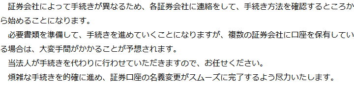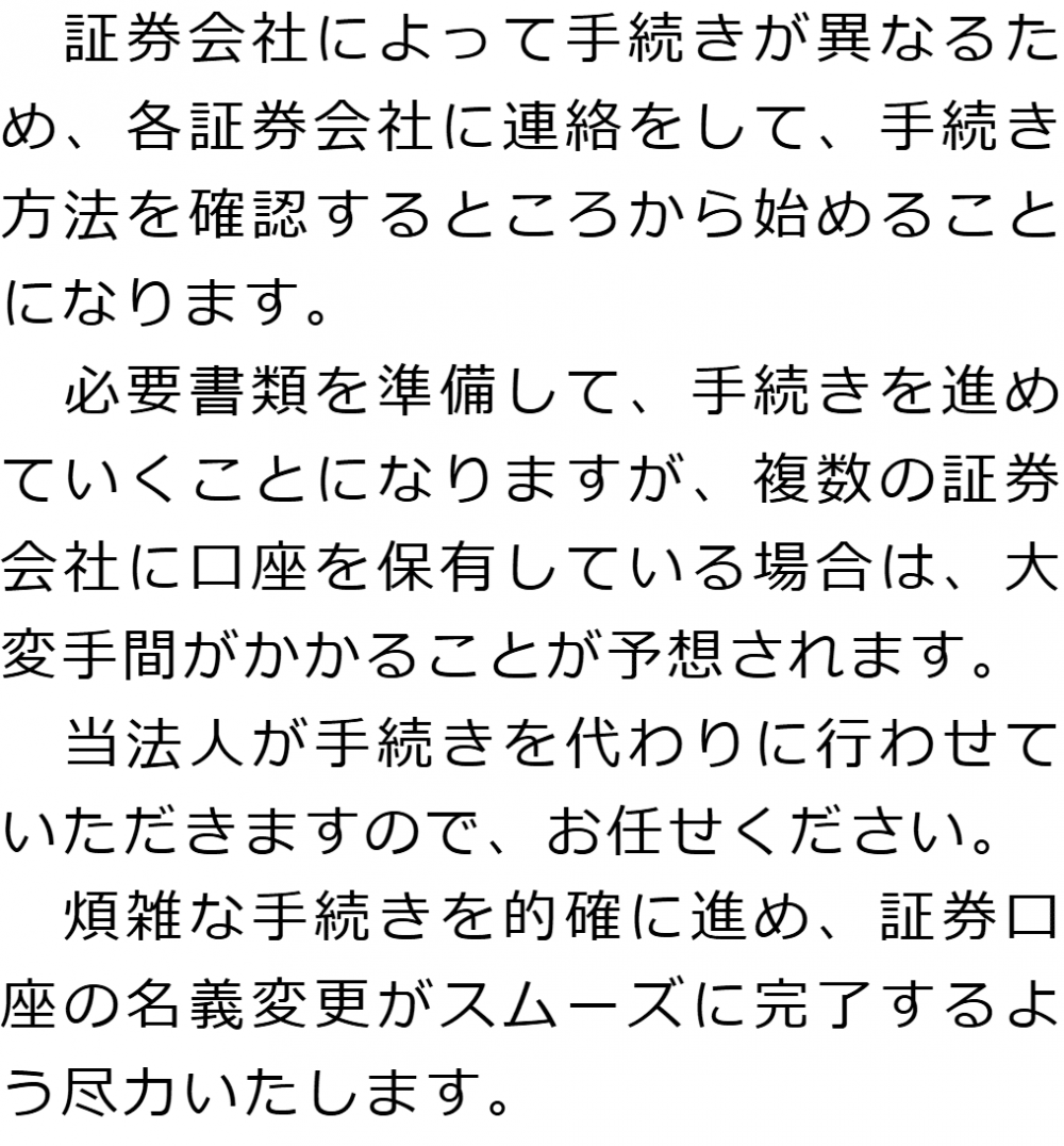 トップ業務内容証券口座の解約・名義変更 階層構造▼ 業務内容(目次) 証券口座の解約・名義変更 業務内容(目次)業務内容トップ行政書士法人心の業務内容遺言遺産整理相続人調査相続財産調査遺産分割協議書の作成預金・貯金の解約・名義変更証券口座の解約・名義変更自動車の名義変更心グループのその他の業務内容家族信託・民事信託節税対策事業承継遺言の検認相続放棄限定承認遺産分割遺留分侵害額請求相続登記相続税申告相続税調査 受付時間 平日 9時~21時、土日祝 9時~18時 夜間・土日祝の相談も対応します (要予約) 所在地 〒250-0011 神奈川県小田原市栄町1‐8-1Y&Yビルディング3F 0120-2403-39 お問合せ・アクセス・地図