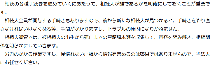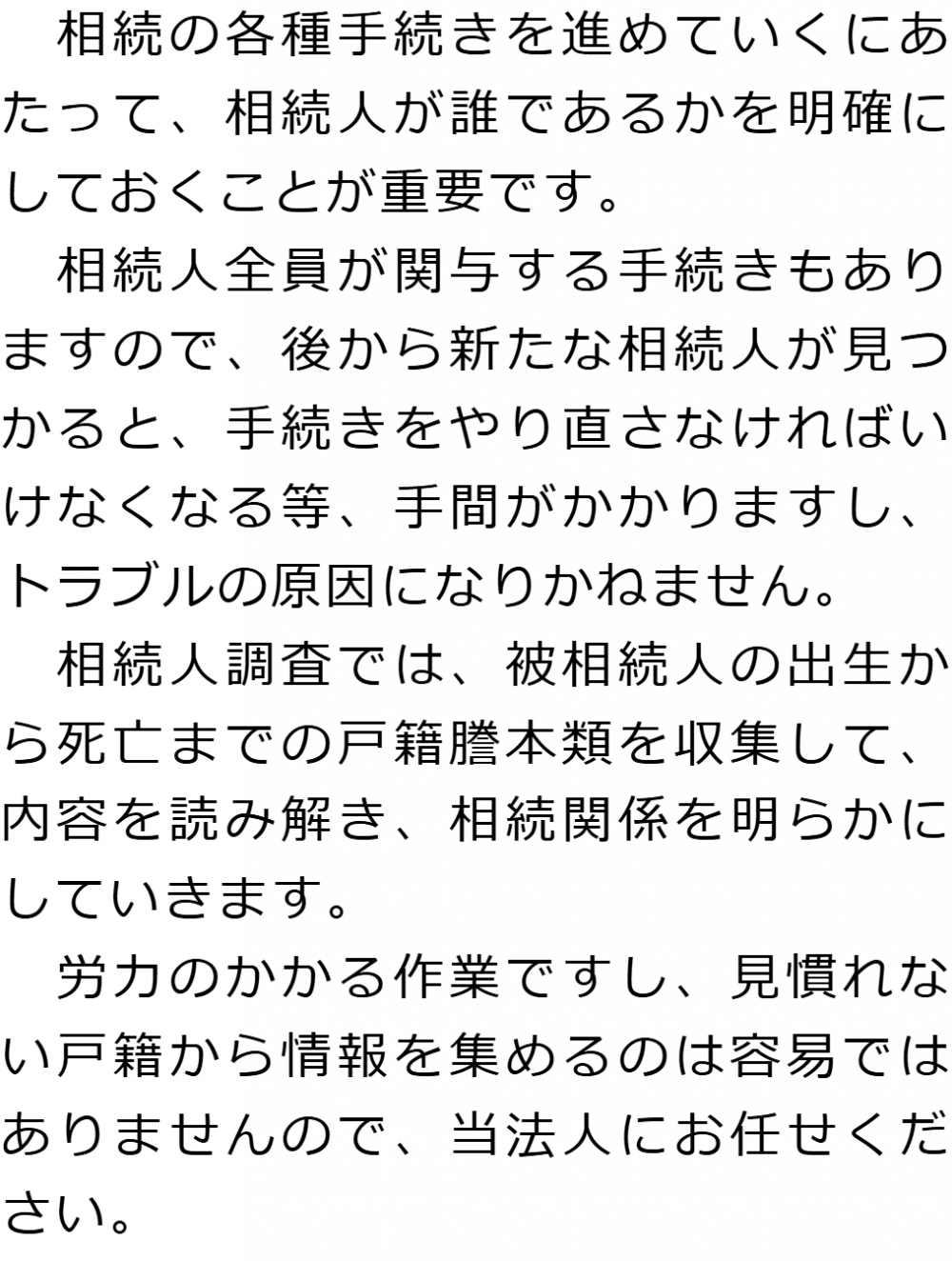 トップ業務内容相続人調査 階層構造▼ 業務内容(目次) 相続人調査 業務内容(目次)業務内容トップ行政書士法人心の業務内容遺言遺産整理相続人調査相続財産調査遺産分割協議書の作成預金・貯金の解約・名義変更証券口座の解約・名義変更自動車の名義変更心グループのその他の業務内容家族信託・民事信託節税対策事業承継遺言の検認相続放棄限定承認遺産分割遺留分侵害額請求相続登記相続税申告相続税調査 受付時間 平日 9時~21時、土日祝 9時~18時 夜間・土日祝の相談も対応します (要予約) 所在地 〒250-0011 神奈川県小田原市栄町1‐8-1Y&Yビルディング3F 0120-2403-39 お問合せ・アクセス・地図