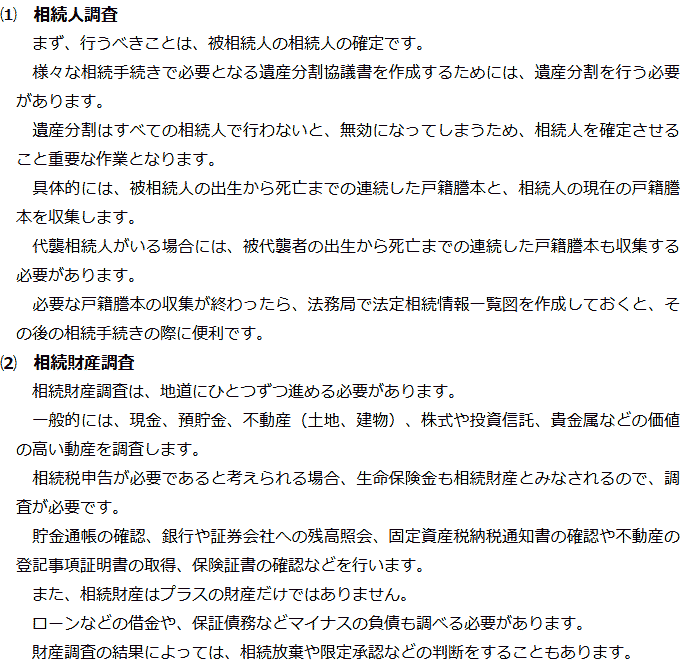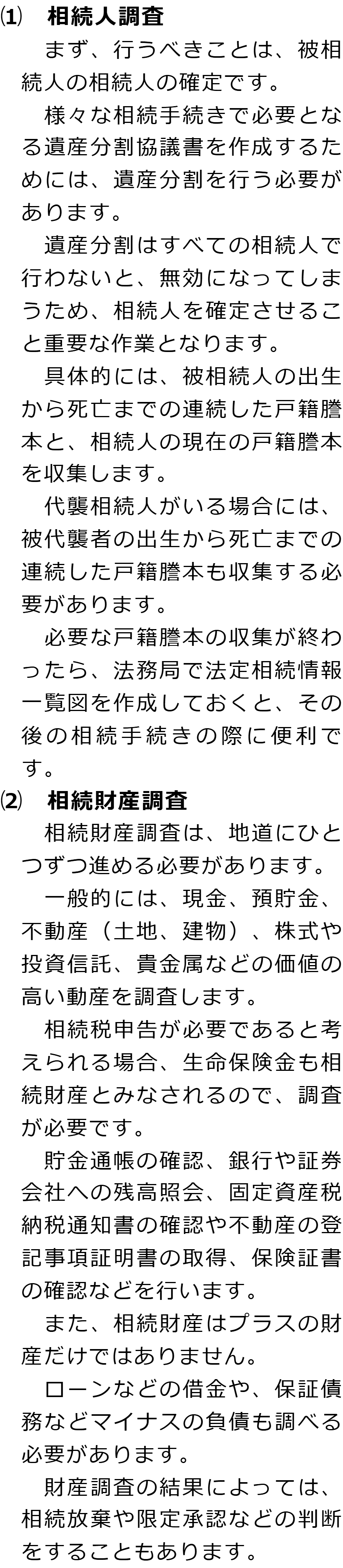 相続手続きの必要事項に関するQ&AQ相続手続きでは何をする必要がありますか?Q相続人調査と相続財産調査では何をする必要がありますか?Q遺産分割では何が必要ですか?Q相続登記はどのような場合に必要ですか?Q相続税申告はどのような場合に必要ですか? Q相続手続きでは何をする必要がありますか?AQ相続人調査と相続財産調査では何をする必要がありますか?AQ遺産分割では何が必要ですか?AQ相続登記はどのような場合に必要ですか?AQ相続税申告はどのような場合に必要ですか?A Q&A(目次)Q&Aトップ相続手続きの必要事項に関するQ&A 受付時間 平日 9時~21時、土日祝 9時~18時 夜間・土日祝の相談も対応します (要予約) 所在地 〒250-0011 神奈川県小田原市栄町1‐8-1Y&Yビルディング3F 0120-2403-39 お問合せ・アクセス・地図