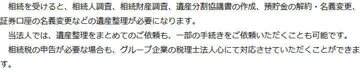 トップ業務内容遺産整理 階層構造▼ 業務内容(目次) 遺産整理 業務内容(目次)業務内容トップ行政書士法人心の業務内容遺言遺産整理相続人調査相続財産調査遺産分割協議書の作成預金・貯金の解約・名義変更証券口座の解約・名義変更自動車の名義変更心グループのその他の業務内容家族信託・民事信託節税対策事業承継遺言の検認相続放棄限定承認遺産分割遺留分侵害額請求相続登記相続税申告相続税調査 受付時間 平日 9時~21時、土日祝 9時~18時 夜間・土日祝の相談も対応します (要予約) 所在地 〒250-0011 神奈川県小田原市栄町1‐8-1Y&Yビルディング3F 0120-2403-39 お問合せ・アクセス・地図