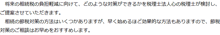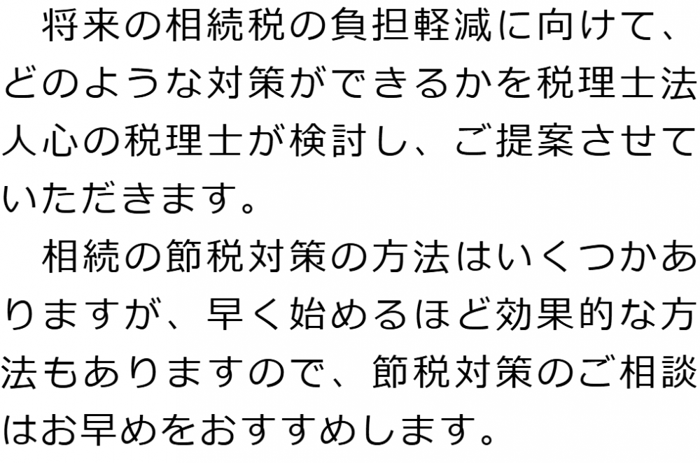 トップ業務内容節税対策 階層構造▼ 業務内容(目次) 節税対策 業務内容(目次)業務内容トップ行政書士法人心の業務内容遺言遺産整理相続人調査相続財産調査遺産分割協議書の作成預金・貯金の解約・名義変更証券口座の解約・名義変更自動車の名義変更心グループのその他の業務内容家族信託・民事信託節税対策事業承継遺言の検認相続放棄限定承認遺産分割遺留分侵害額請求相続登記相続税申告相続税調査 受付時間 平日 9時~21時、土日祝 9時~18時 夜間・土日祝の相談も対応します (要予約) 所在地 〒250-0011 神奈川県小田原市栄町1‐8-1Y&Yビルディング3F 0120-2403-39 お問合せ・アクセス・地図