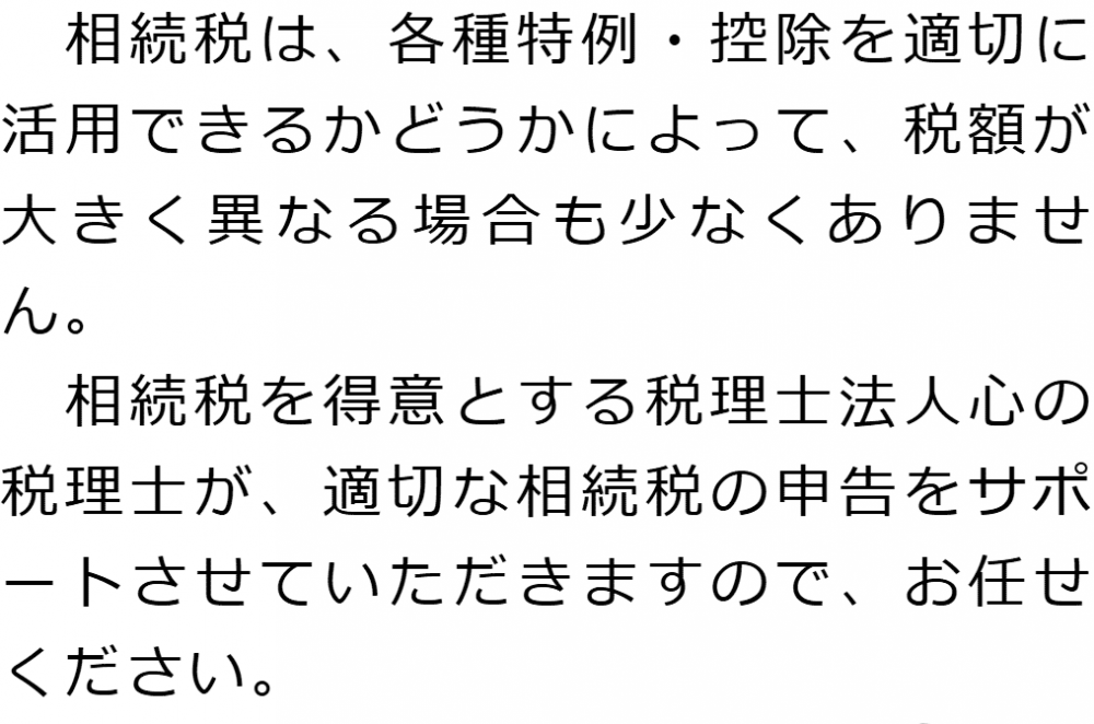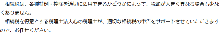 トップ業務内容相続税申告 階層構造▼ 業務内容(目次) 相続税申告 業務内容(目次)業務内容トップ行政書士法人心の業務内容遺言遺産整理相続人調査相続財産調査遺産分割協議書の作成預金・貯金の解約・名義変更証券口座の解約・名義変更自動車の名義変更心グループのその他の業務内容家族信託・民事信託節税対策事業承継遺言の検認相続放棄限定承認遺産分割遺留分侵害額請求相続登記相続税申告相続税調査 受付時間 平日 9時~21時、土日祝 9時~18時 夜間・土日祝の相談も対応します (要予約) 所在地 〒250-0011 神奈川県小田原市栄町1‐8-1Y&Yビルディング3F 0120-2403-39 お問合せ・アクセス・地図